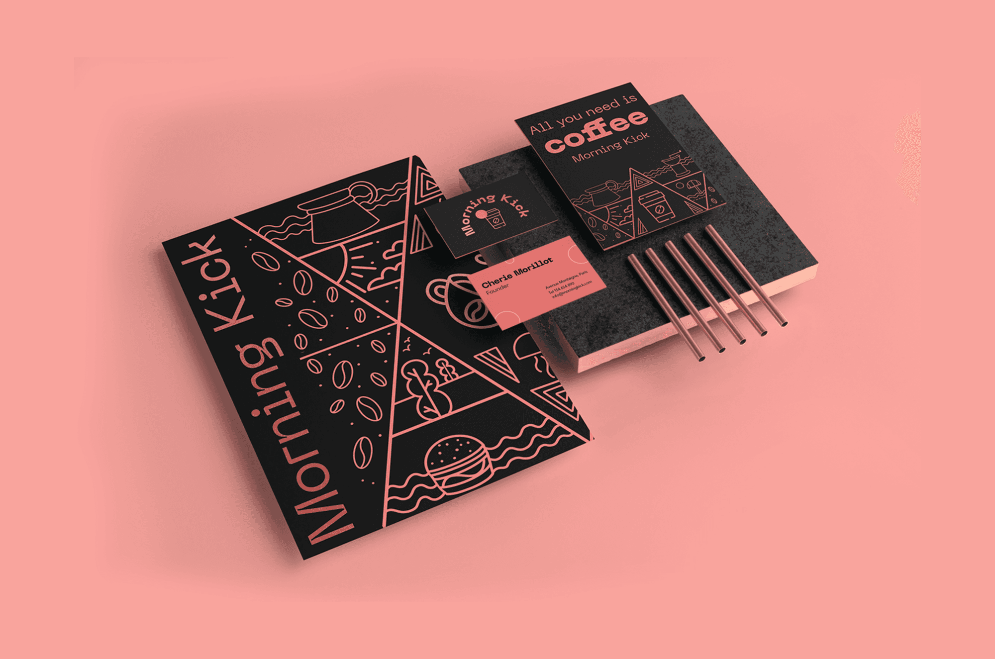 To design Morning Kick's brand, I checked other coffee brands, spoke with the team to understand what made their coffee special, and looked into their audience's preferences. I created boards to decide on colors and styles, aiming for a standout design that reflected Morning Kick's commitment to the environment and local communities.